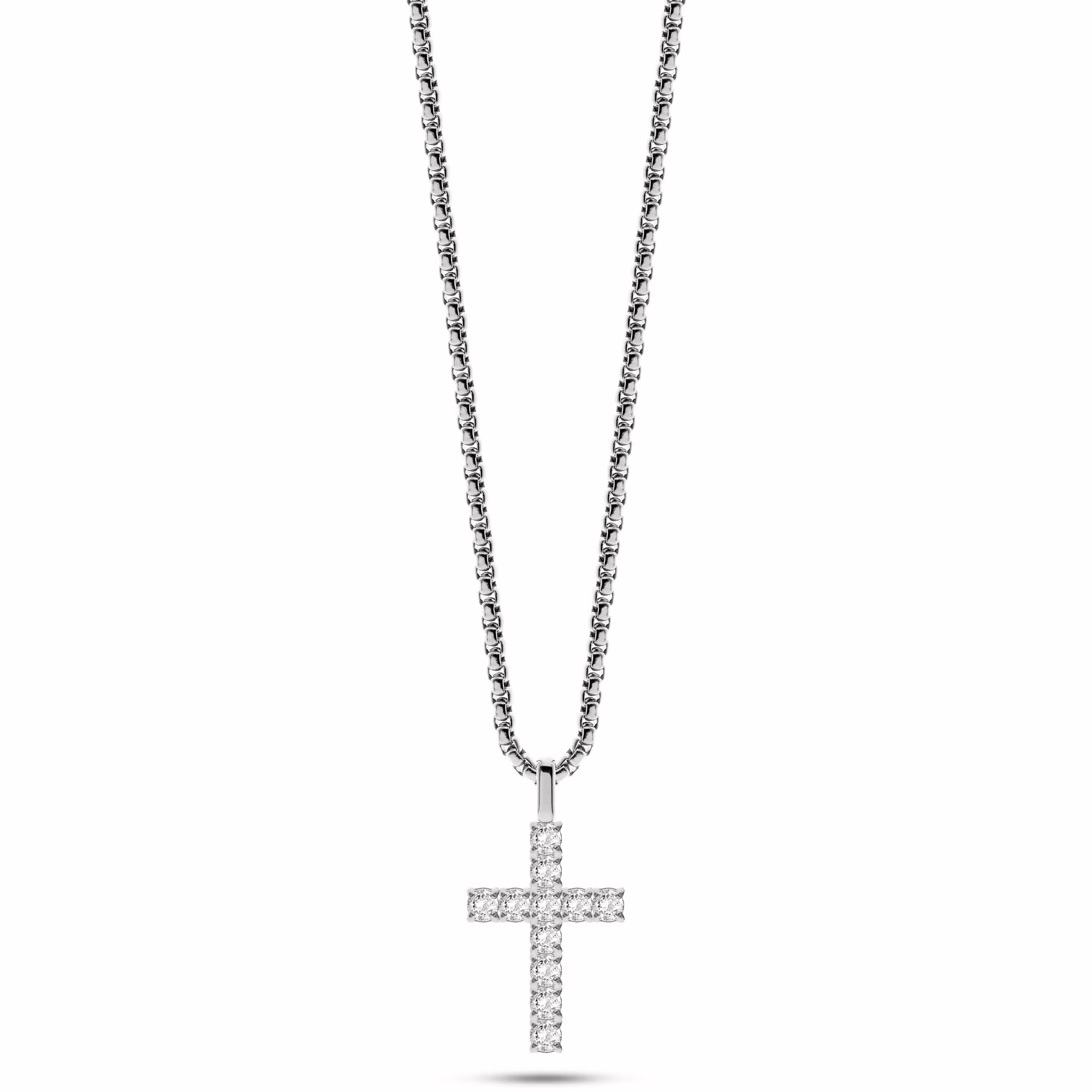 Elegantna moška verižica s križem, okrašenim s sijočimi kamni, združuje simboliko, urejen slog in sodobno prefinjenost.