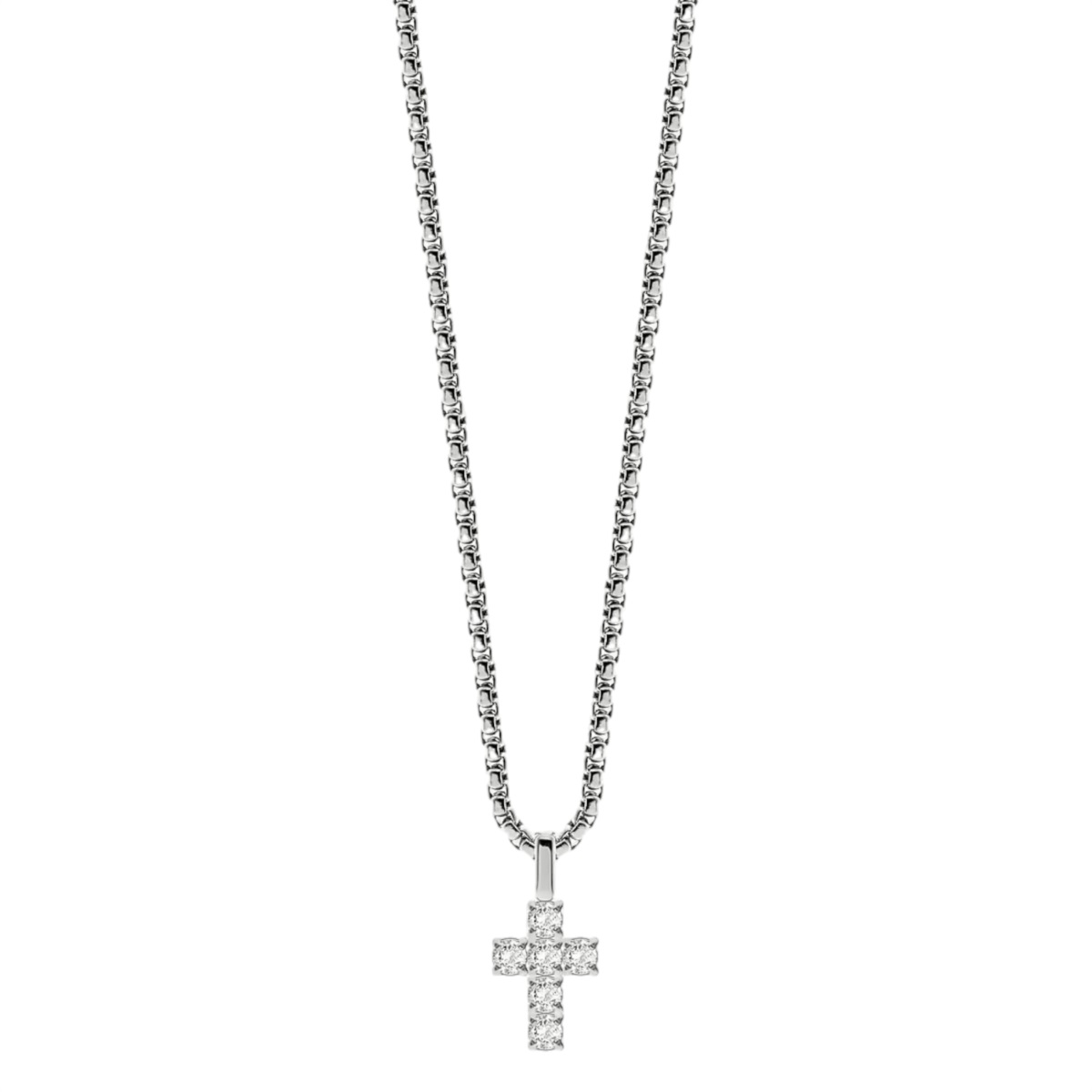 Elegantna moška verižica s križem in sijočimi kamni izraža samozavest, urejen slog in sodobno eleganco.
